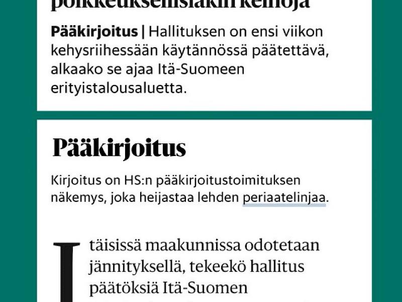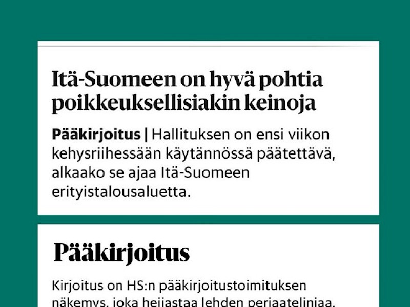 Helsingin Sanomat 17.4. toi esiin pääkirjoituksessaan itäisen Suomen erityistalousaluekokeilun aloittamisen.
