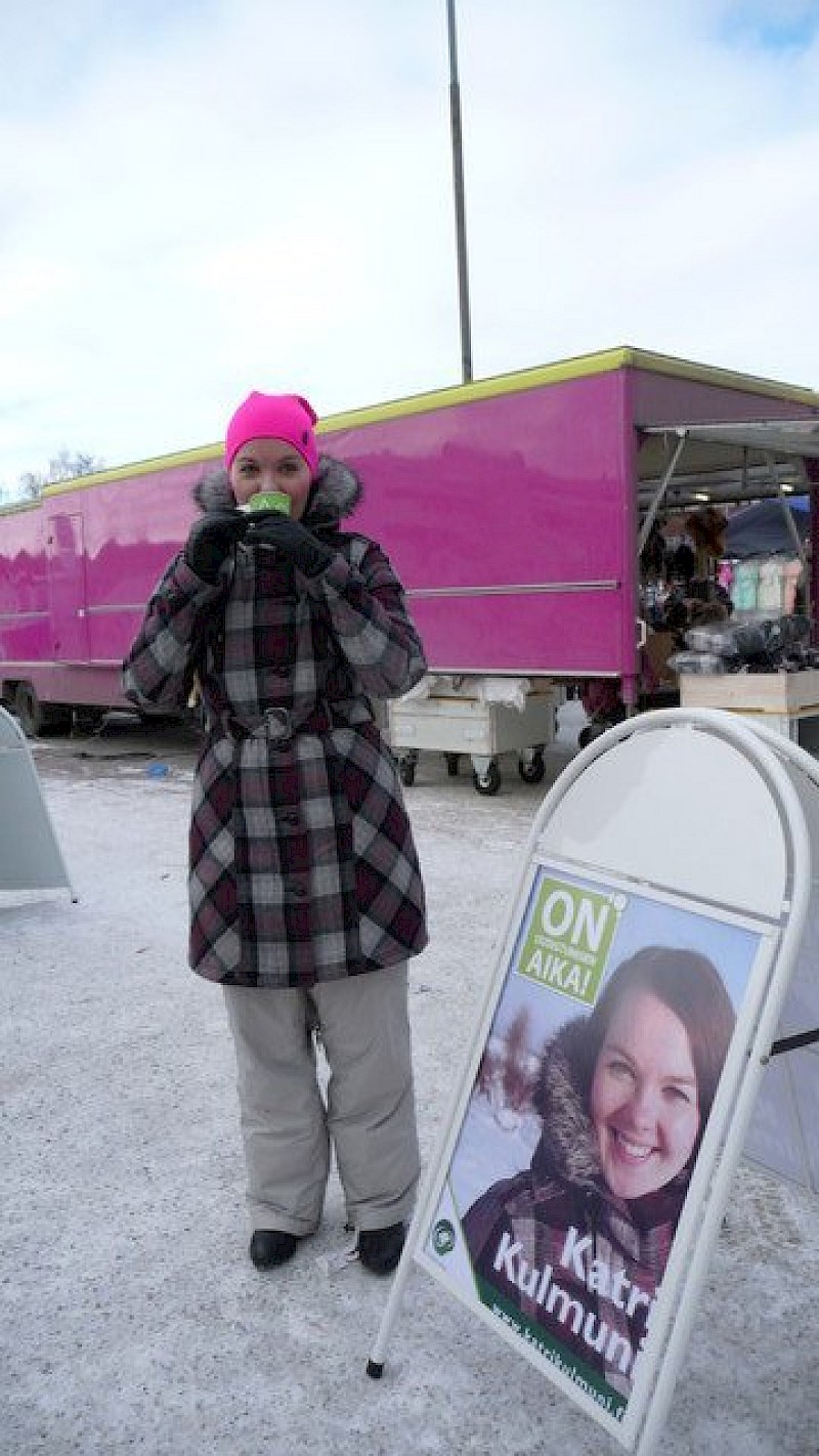 Eduskuntavaalit ovat myös yksi keskustelufoorumi, jossa erilaisia yhteiskunnallisia näkemyksiä voi tuoda esiin. Silläkin on iso merkitys yhteiskunnassamme. Tämä kuva on otettu maaliskuussa 2011, jolloin olin Kemin markkinoilla. Kuvassa lämmittelen juomalla kuumaa mustaherukkamehua.