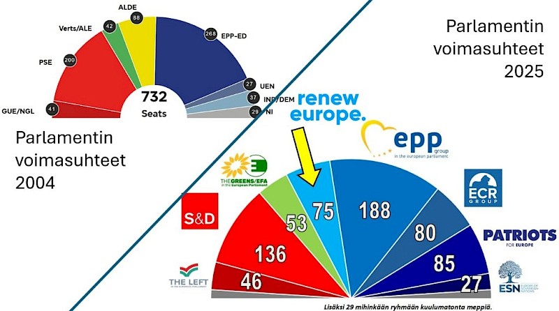 Olen käyttänyt useissa diaesityksissä EU-parlamentin viimeisen 20 vuoden aikana tapahtuneesta voimasuhteiden muutoksesta kertovaa kuvaa, kun minua on pyydetty puhumaan EU-parlamentin toiminnasta. Kuva kertoo siitä poliittisesta muutoksesta, joka eurooppalaisessa puoluekartassa on tapahtunut. Poliittisen kartan oikean laidan vahvistumista korostaa vielä se, että tässä välissä EU-parlamentista ovat poistuneet brittikonservatiivien ja Nigel Faragen ryhmät, jotka vuorollaan ovat olleet melko suuret, mutta oikea laita on silti kasvanut.