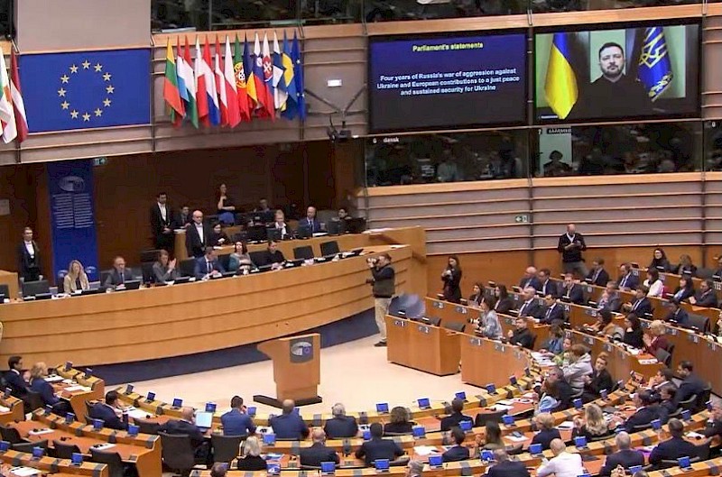EU-parlamentissa pidettiin tänään erityinen istunto sodan alkamisen vuosipäivän johdosta. Ukrainan presidentti Zelenskyi puhui kokouksen alussa etäyhteyden päässä, minkä jälkeen eri parlamenttiryhmien edustajat käyttivät puheenvuoroja. Parlamentti myös äänesti Ukrainan sotaan liittyvistä päätöslauselmista.